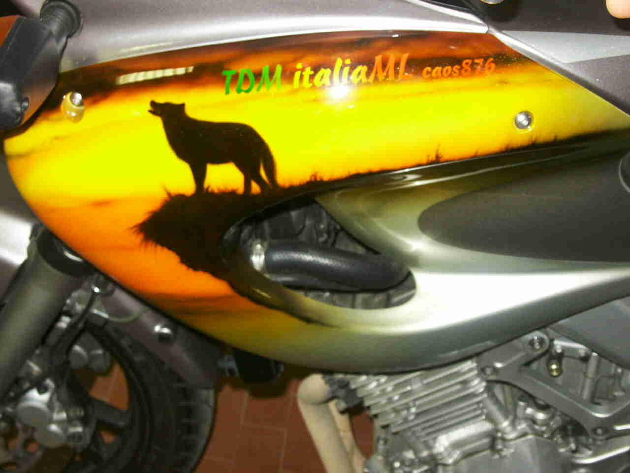 In queste due immagini le foto delle fiancatine aerografate del TDM 850 di Caos876 . Davvero bellissime, complimenti.